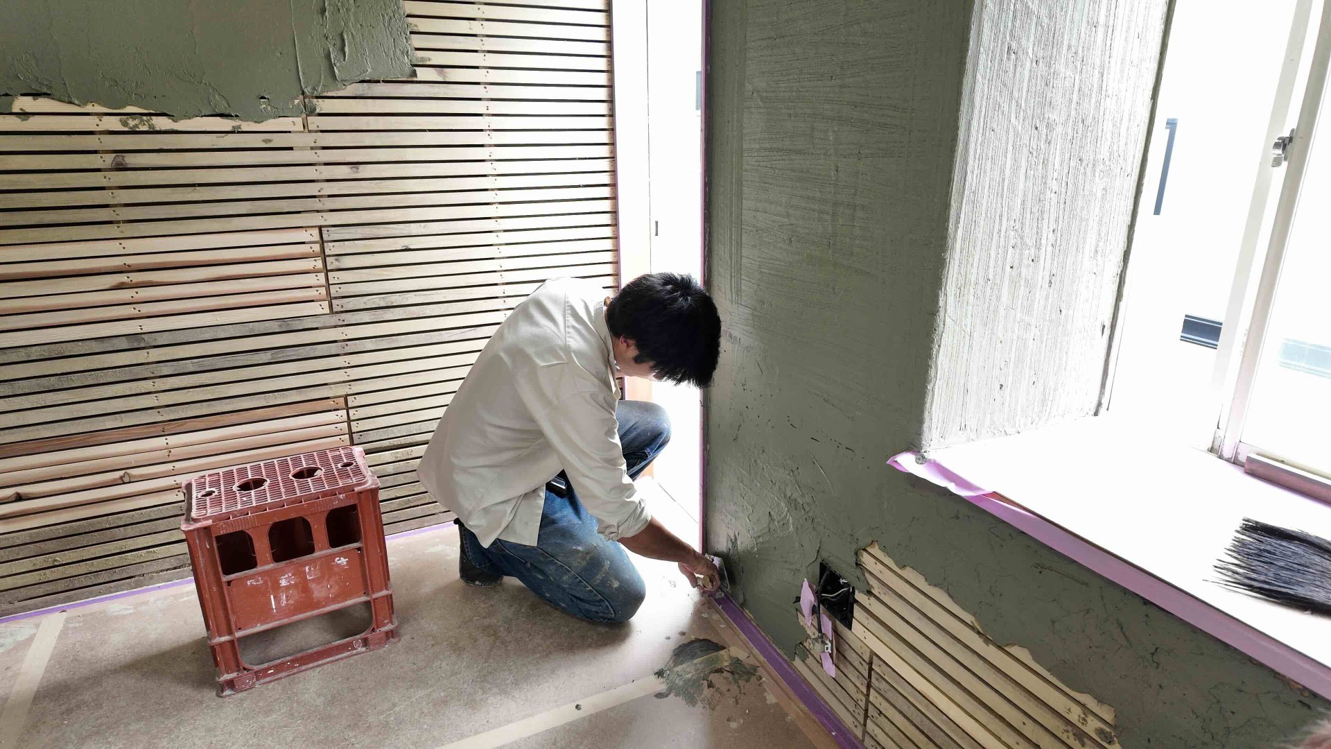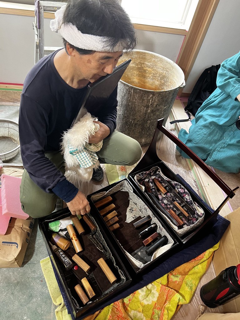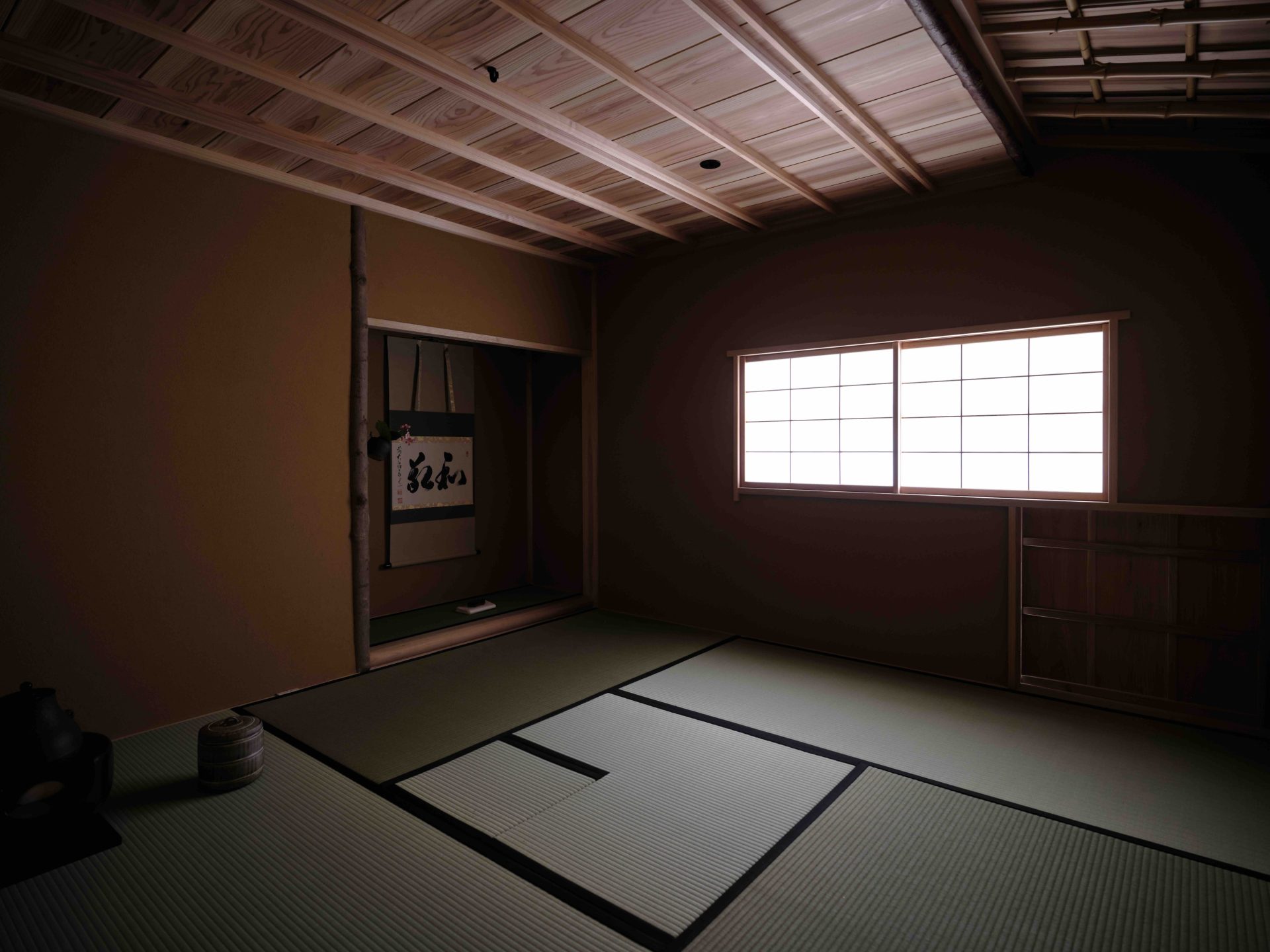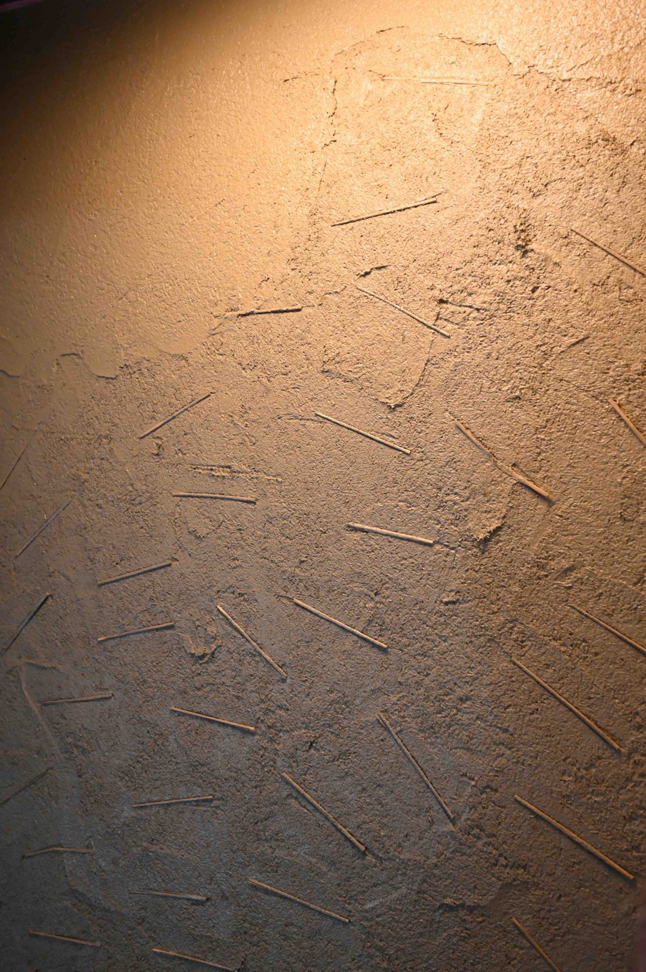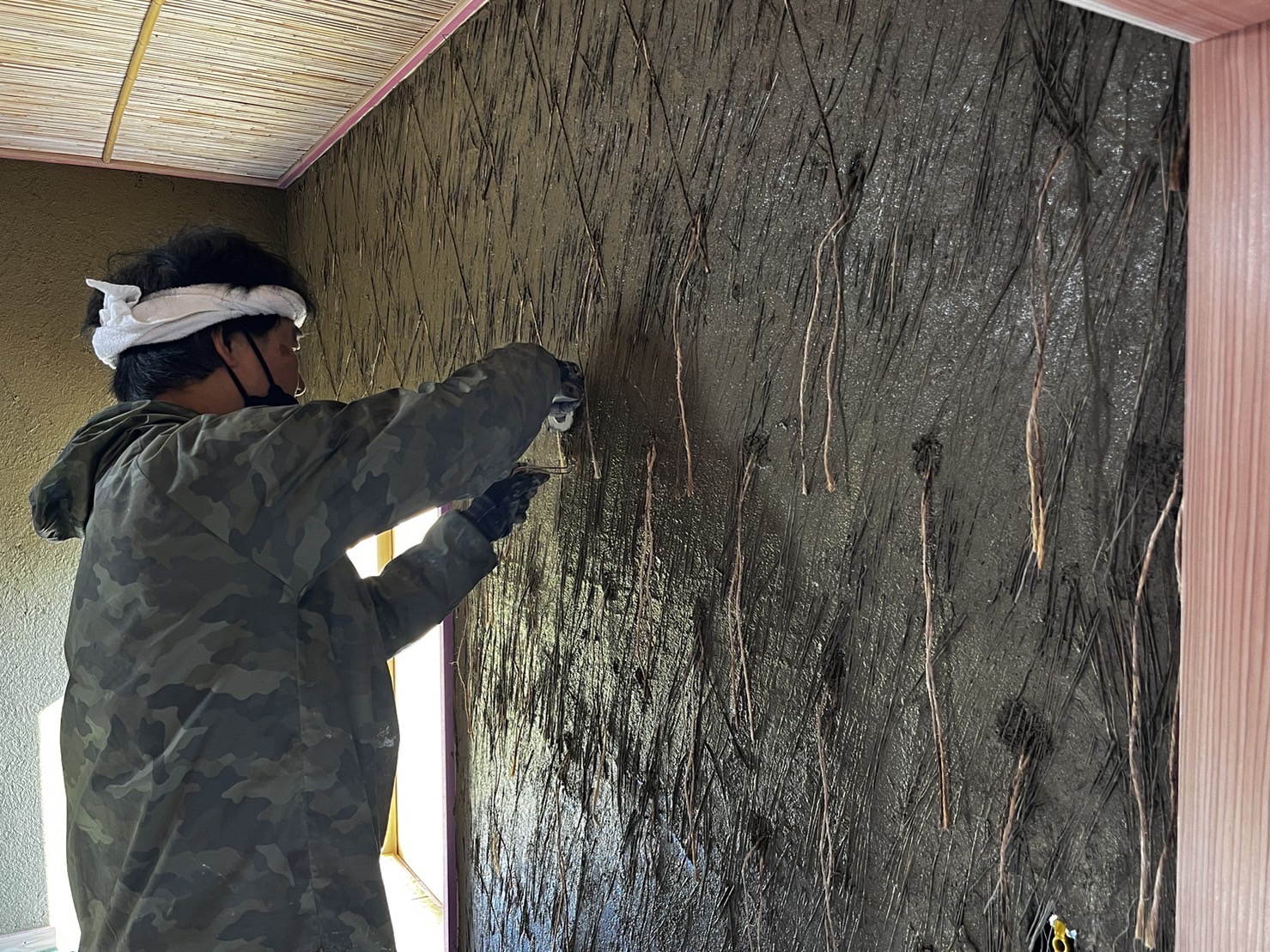 ここまで終わったら、約1ヶ月かけてカラカラに乾燥させる。冬場の場合は、もう少しかかることもある。伝統構法の土壁というのは、こういうところで時間がかかるので、工期に制限があると使いにくいのだけれど、一生に一度の大切に家であるからこそ、これくらいの余裕は持ちたいものだ。乾燥したら、上塗りに入る。上塗りは聚楽土・稲荷山黄土・浅葱土・白土など、様々な産地の土を好みで用いる。これらの土には様々な色があって、好みに応じてブレンドして使うこともできる。ますいいリビングカンパニーのモデルハウスにある茶室には、聚楽土と沖縄の赤土を混ぜた、少し鮮やかな土壁が塗られている。僕の家の茶室には、グーッと色が沈み込んだような錆びた色合いの聚楽土を塗ってもらった。上塗りの際には「土・細かい藁・砂」を混ぜた上塗り土を2回に分けて、薄く塗りつける。その仕上げ方も、フワッとした感じの平滑な仕上げから、コテを引きずって仕上げる引きずり仕上げ、太くて長い藁を円相の形に散らしたところに薄く土を塗りつけて引きずって仕上げる投げすさ仕上げなど様々だ。投げすさ仕上げというのは、千利休が作ったとされている、京都の大山崎にある妙喜庵「待庵」の壁の仕上げである。僕の家の茶室の床間の中はこの投げスサ仕上げなのだが、時間と共に、少しずつ土が錆びてきて、対照的に藁がボンヤリ姿を現してくる様子は、見ていてとても楽しい物である。左官の壁は時間を感じることができるのだ。今回の床の間の中は、黒い仕上げとしてそこにシルバーの紅葉の模様を散らす。これは改修工事前の床の間の意匠と同じである。