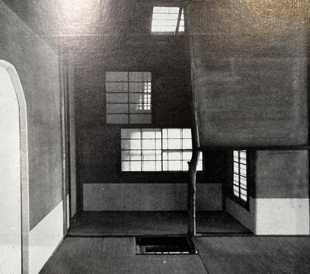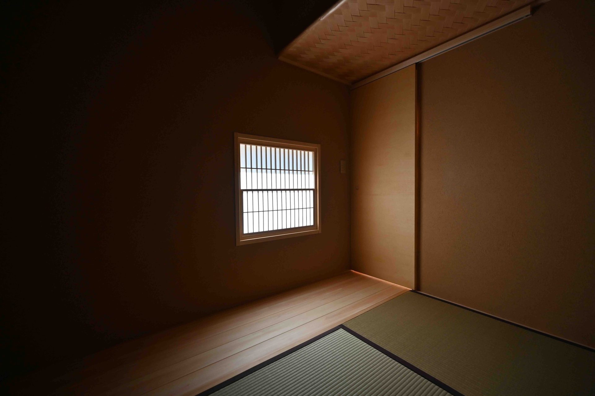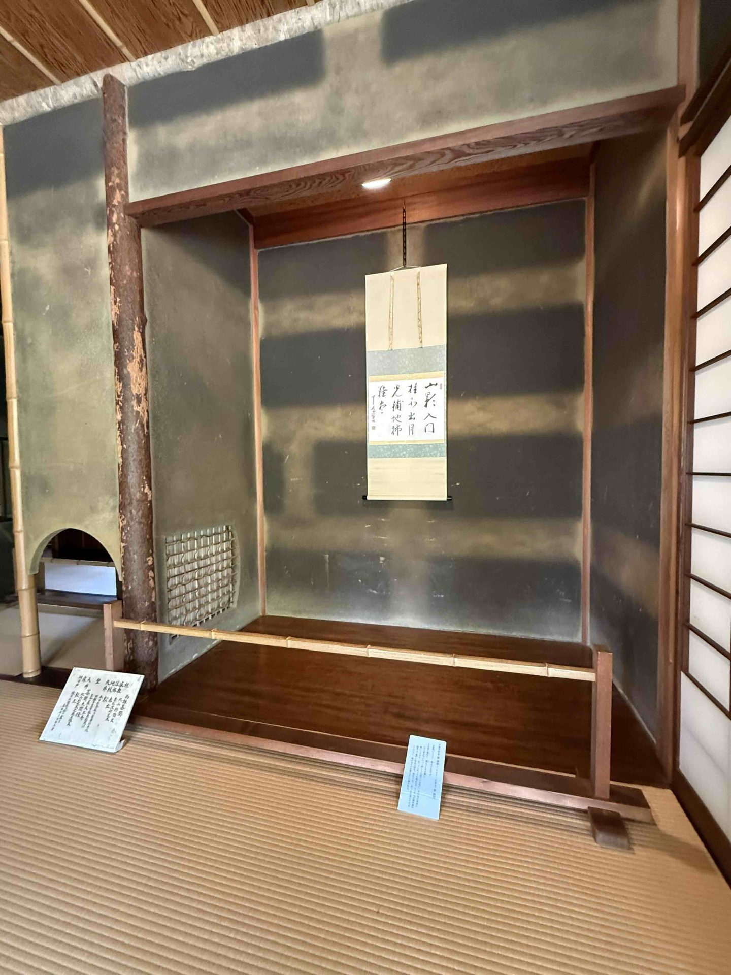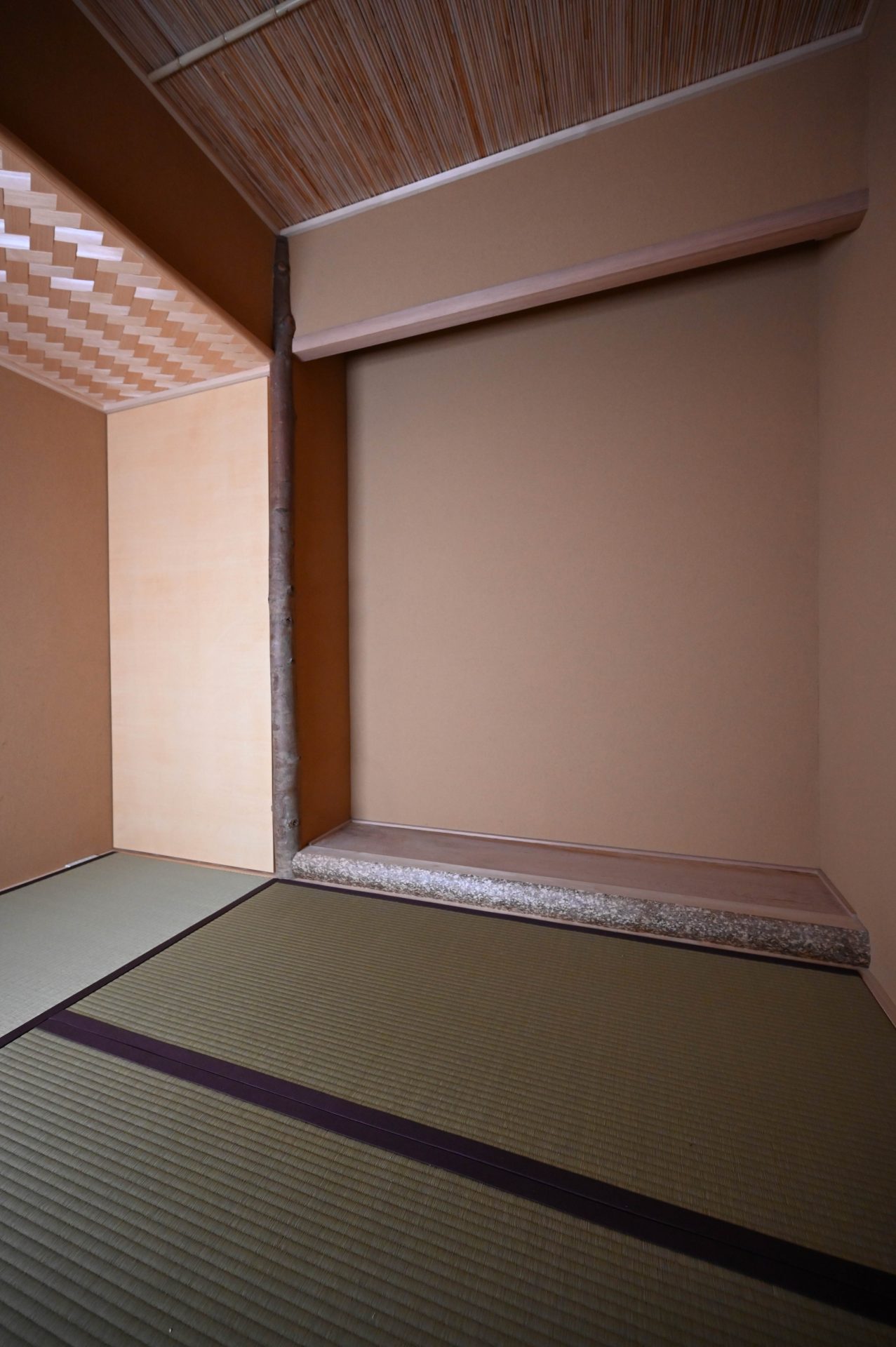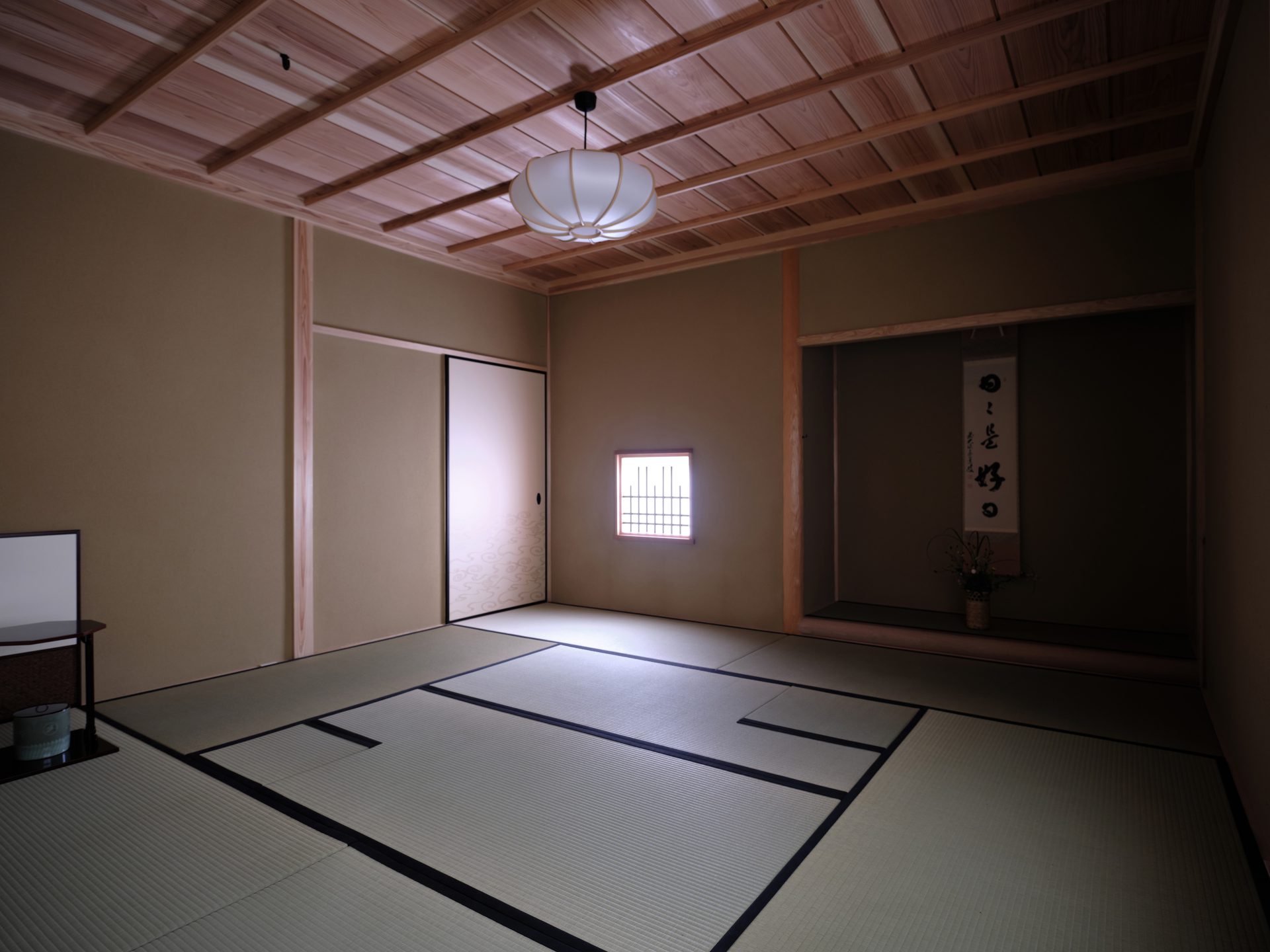 ここまで終わったら、約1ヶ月かけてカラカラに乾燥させる。冬場の場合は、もう少しかかることもある。伝統構法の土壁というのは、こういうところで時間がかかるので、工期に制限があると使いにくいのだけれど、一生に一度の大切に家であるからこそ、これくらいの余裕は持ちたいものだ。乾燥したら、上塗りに入る。上塗りは聚楽土・稲荷山黄土・浅葱土・白土など、様々な産地の土を好みで用いる。これらの土には様々な色があって、好みに応じてブレンドして使うこともできる。ますいいリビングカンパニーのモデルハウスにある茶室には、聚楽土と沖縄の赤土を混ぜた、少し鮮やかな土壁が塗られている。僕の家の茶室には、グーッと色が沈み込んだような錆びた色合いの聚楽土を塗ってもらった。上塗りの際には「土・細かい藁・砂」を混ぜた上塗り土を2回に分けて、薄く塗りつける。その仕上げ方も、フワッとした感じの平滑な仕上げから、コテを引きずって仕上げる引きずり仕上げ、太くて長い藁を円相の形に散らしたところに薄く土を塗りつけて引きずって仕上げる投げすさ仕上げなど様々だ。投げすさ仕上げというのは、千利休が作ったとされている、京都の大山崎にある妙喜庵「待庵」の壁の仕上げである。僕の家の茶室の床間の中はこの投げスサ仕上げなのだが、時間と共に、少しずつ土が錆びてきて、対照的に藁がボンヤリ姿を現してくる様子は、見ていてとても楽しい物である。左官の壁は時間を感じることができるのだ。今回の床の間の中は、黒い仕上げとしてそこにシルバーの紅葉の模様を散らす。これは改修工事前の床の間の意匠と同じである。