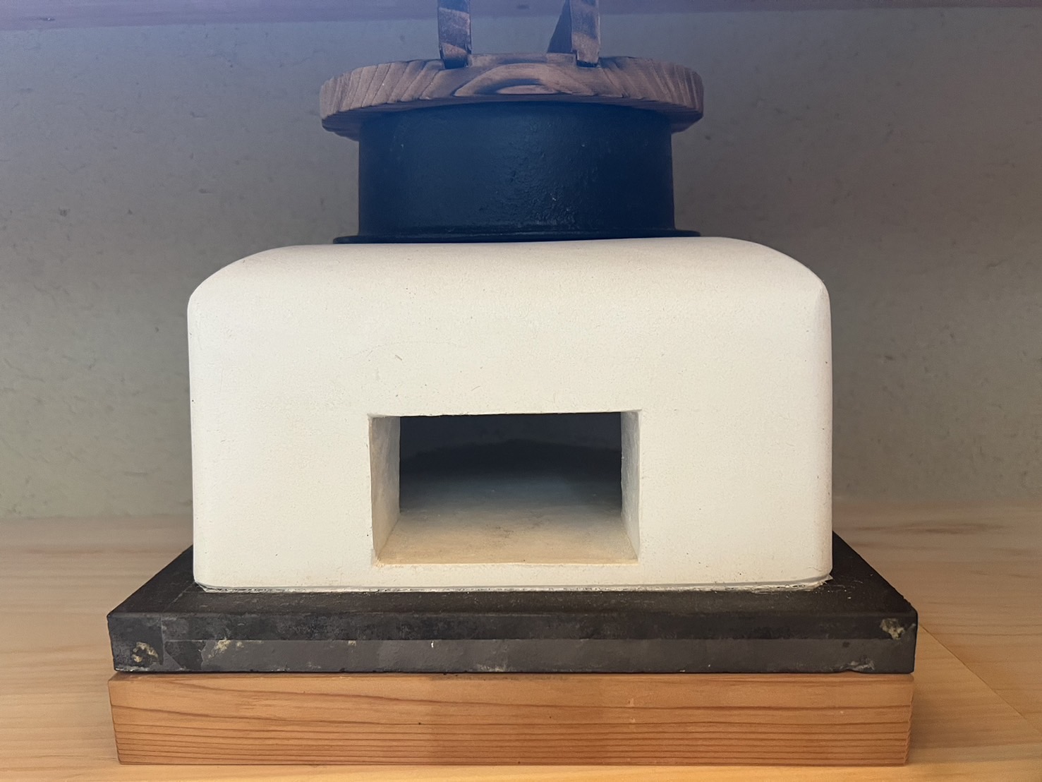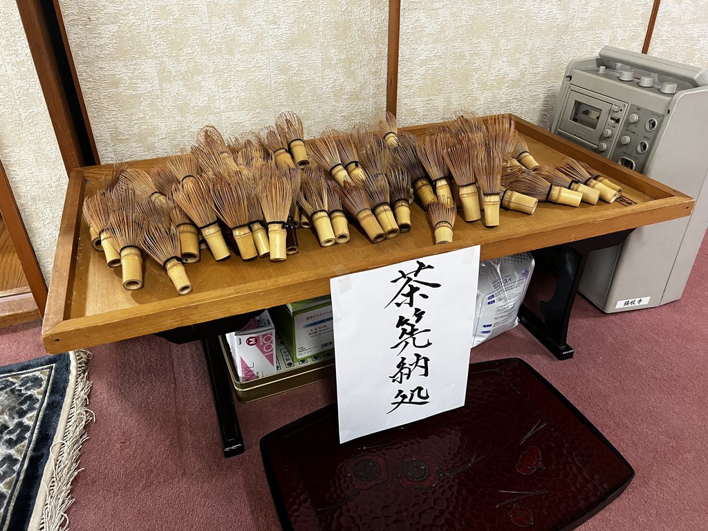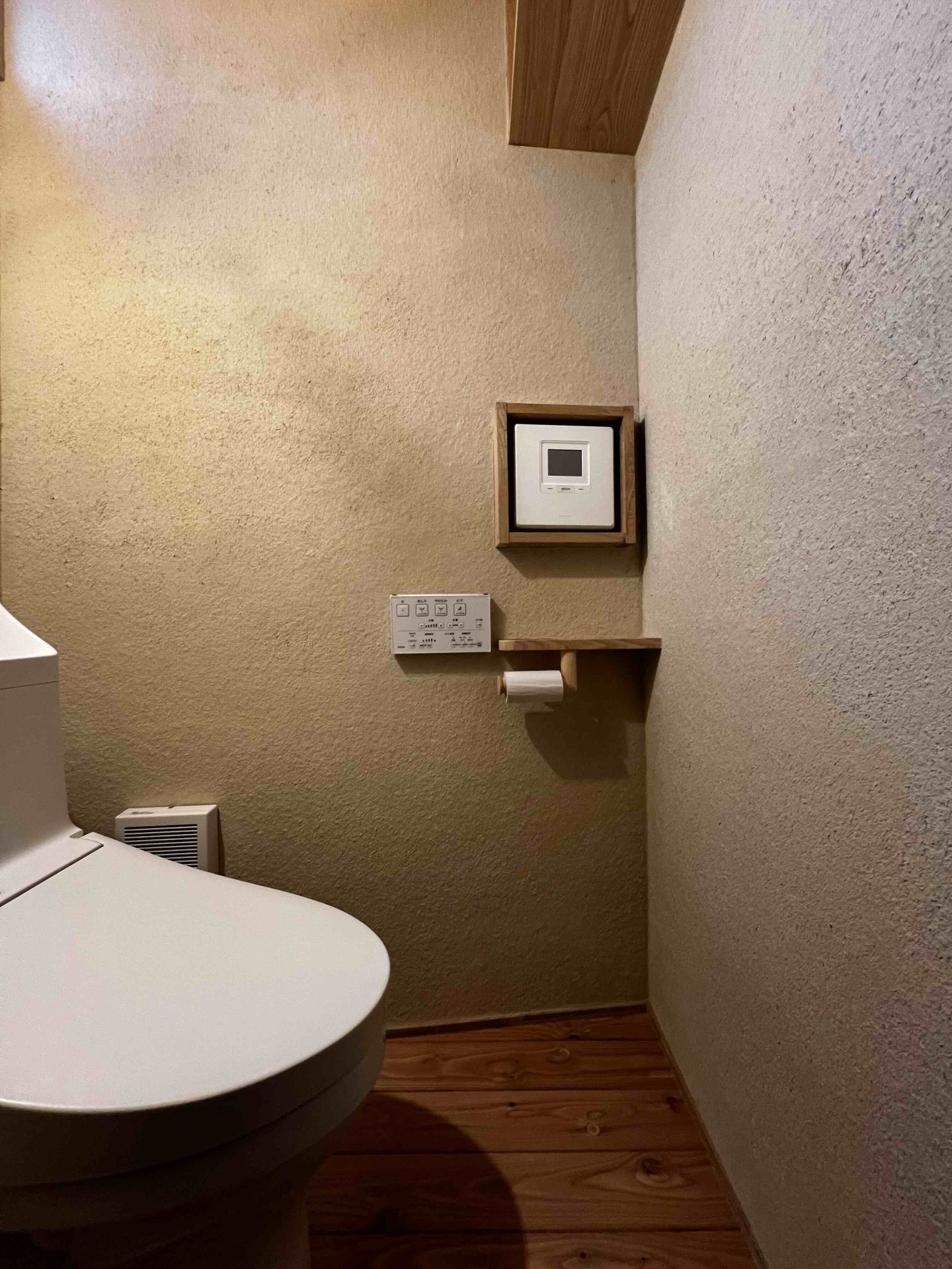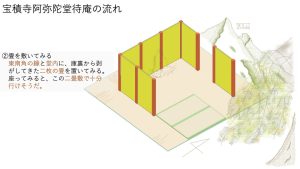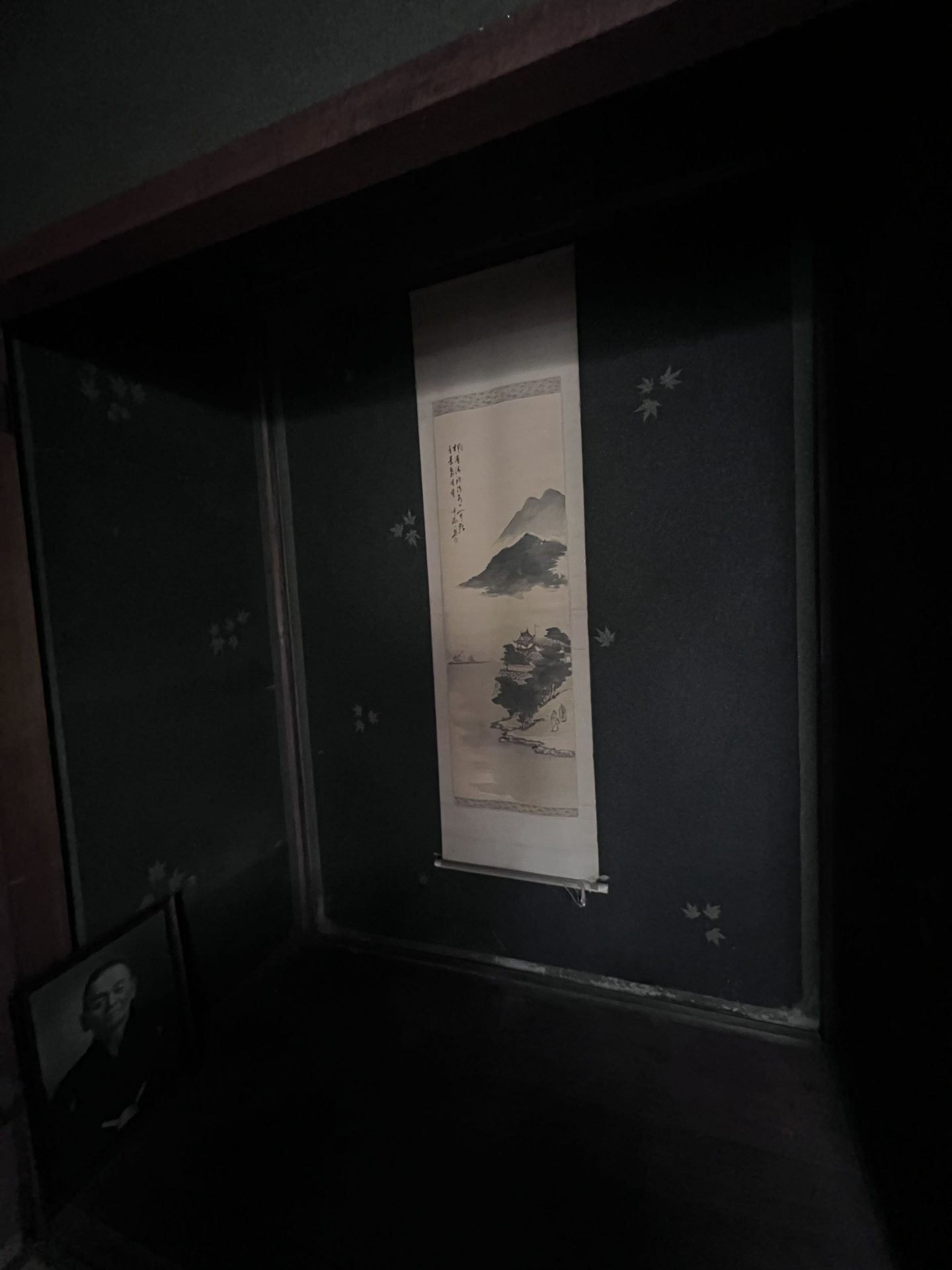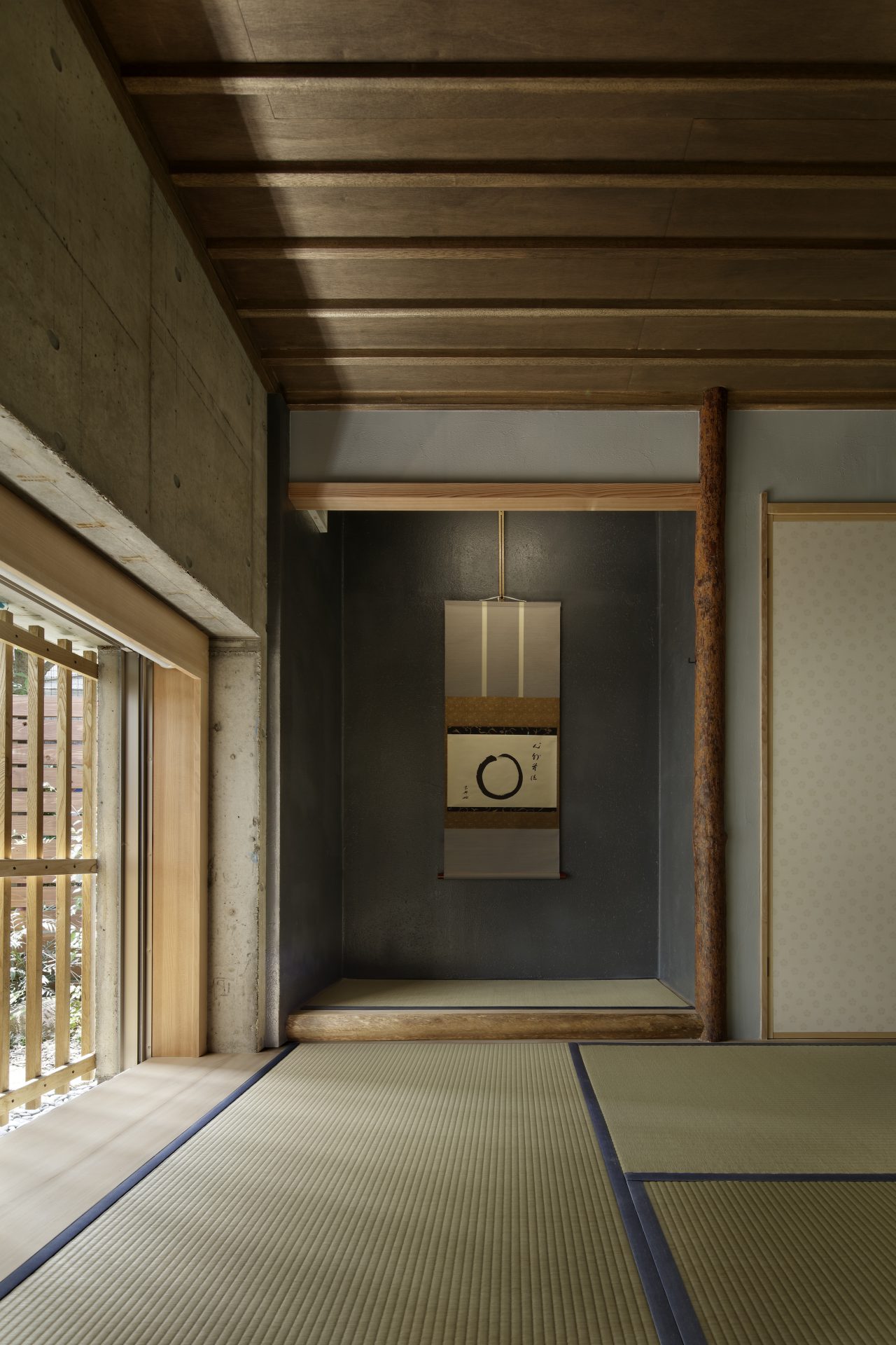 ここまで終わったら、約1ヶ月かけてカラカラに乾燥させる。冬場の場合は、もう少しかかることもある。伝統構法の土壁というのは、こういうところで時間がかかるので、工期に制限があると使いにくいのだけれど、一生に一度の大切に家であるからこそ、これくらいの余裕は持ちたいものだ。乾燥したら、上塗りに入る。上塗りは聚楽土・稲荷山黄土・浅葱土・白土など、様々な産地の土を好みで用いる。これらの土には様々な色があって、好みに応じてブレンドして使うこともできる。ますいいリビングカンパニーのモデルハウスにある茶室には、聚楽土と沖縄の赤土を混ぜた、少し鮮やかな土壁が塗られている。僕の家の茶室には、グーッと色が沈み込んだような錆びた色合いの聚楽土を塗ってもらった。上塗りの際には「土・細かい藁・砂」を混ぜた上塗り土を2回に分けて、薄く塗りつける。その仕上げ方も、フワッとした感じの平滑な仕上げから、コテを引きずって仕上げる引きずり仕上げ、太くて長い藁を円相の形に散らしたところに薄く土を塗りつけて引きずって仕上げる投げすさ仕上げなど様々だ。投げすさ仕上げというのは、千利休が作ったとされている、京都の大山崎にある妙喜庵「待庵」の壁の仕上げである。僕の家の茶室の床間の中はこの投げスサ仕上げなのだが、時間と共に、少しずつ土が錆びてきて、対照的に藁がボンヤリ姿を現してくる様子は、見ていてとても楽しい物である。左官の壁は時間を感じることができるのだ。今回の床の間の中は、黒い仕上げとしてそこにシルバーの紅葉の模様を散らす。これは改修工事前の床の間の意匠と同じである。