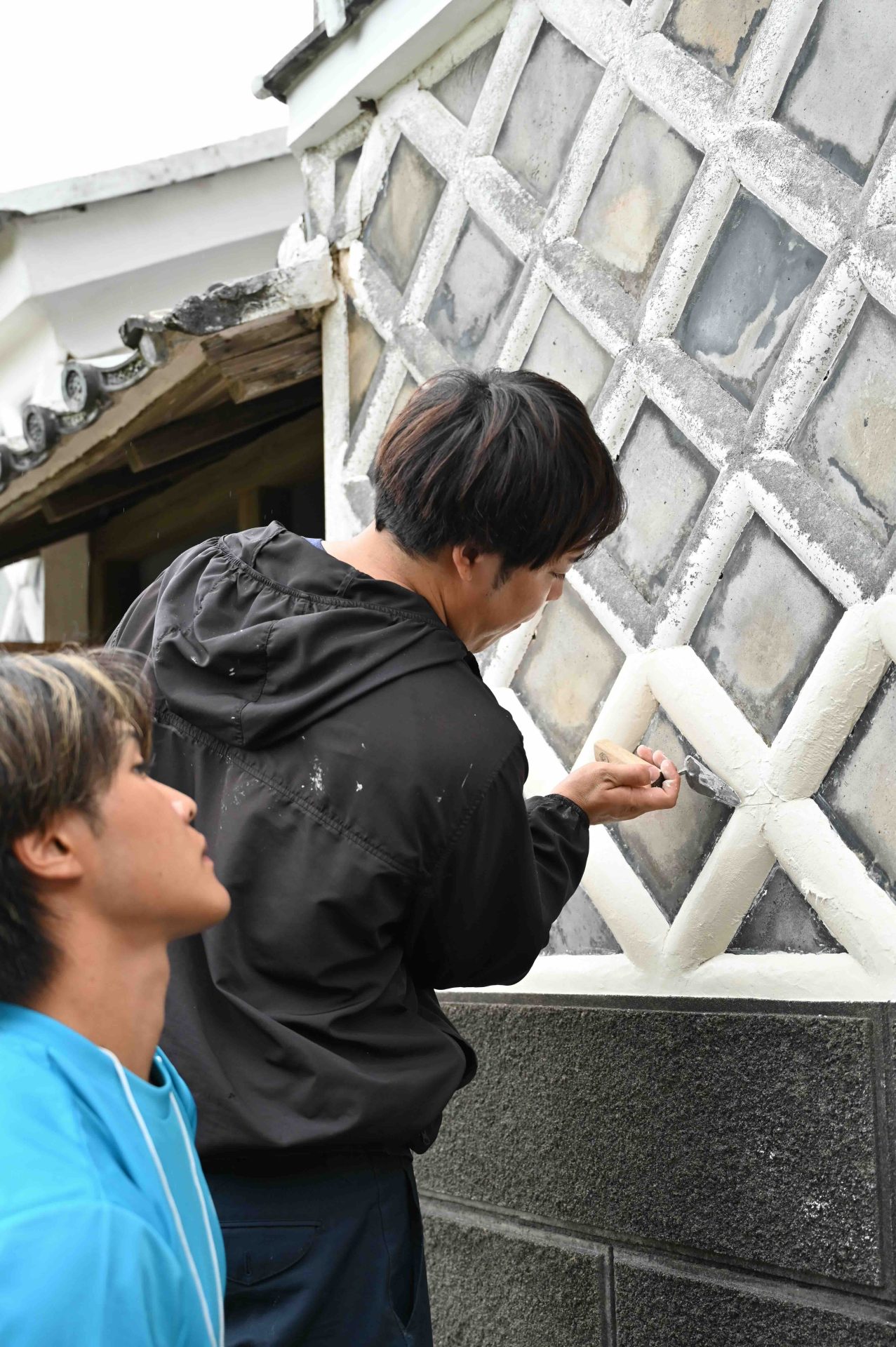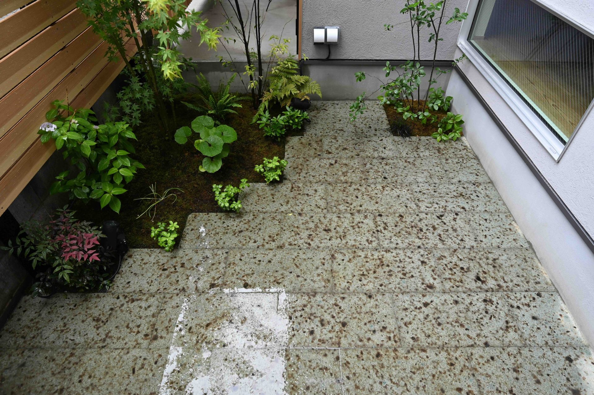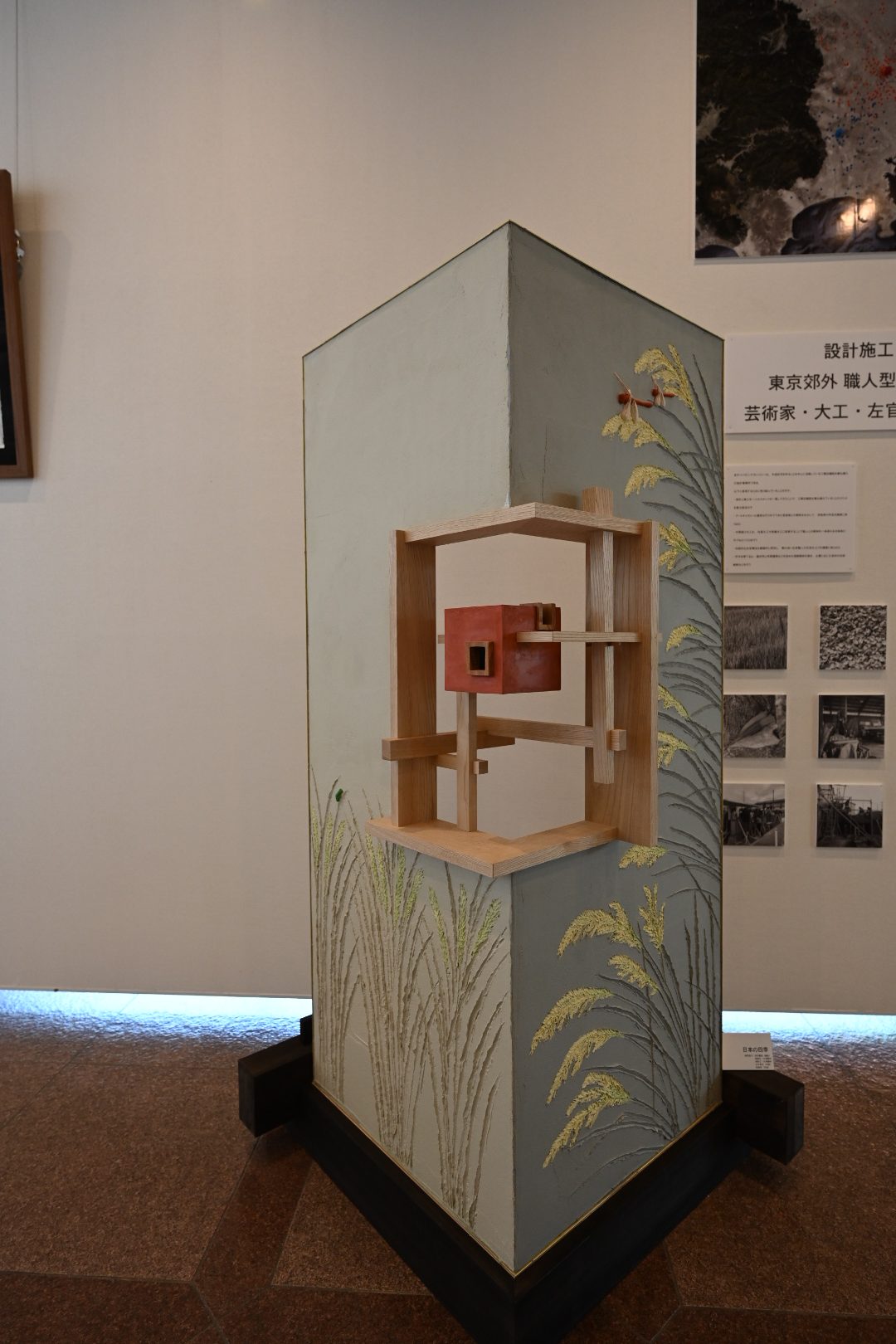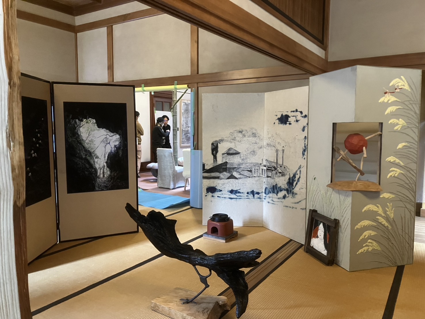 ここまで終わったら、約1ヶ月かけてカラカラに乾燥させる。冬場の場合は、もう少しかかることもある。伝統構法の土壁というのは、こういうところで時間がかかるので、工期に制限があると使いにくいのだけれど、一生に一度の大切に家であるからこそ、これくらいの余裕は持ちたいものだ。乾燥したら、上塗りに入る。上塗りは聚楽土・稲荷山黄土・浅葱土・白土など、様々な産地の土を好みで用いる。これらの土には様々な色があって、好みに応じてブレンドして使うこともできる。ますいいリビングカンパニーのモデルハウスにある茶室には、聚楽土と沖縄の赤土を混ぜた、少し鮮やかな土壁が塗られている。僕の家の茶室には、グーッと色が沈み込んだような錆びた色合いの聚楽土を塗ってもらった。上塗りの際には「土・細かい藁・砂」を混ぜた上塗り土を2回に分けて、薄く塗りつける。その仕上げ方も、フワッとした感じの平滑な仕上げから、コテを引きずって仕上げる引きずり仕上げ、太くて長い藁を円相の形に散らしたところに薄く土を塗りつけて引きずって仕上げる投げすさ仕上げなど様々だ。投げすさ仕上げというのは、千利休が作ったとされている、京都の大山崎にある妙喜庵「待庵」の壁の仕上げである。僕の家の茶室の床間の中はこの投げスサ仕上げなのだが、時間と共に、少しずつ土が錆びてきて、対照的に藁がボンヤリ姿を現してくる様子は、見ていてとても楽しい物である。左官の壁は時間を感じることができるのだ。今回の床の間の中は、黒い仕上げとしてそこにシルバーの紅葉の模様を散らす。これは改修工事前の床の間の意匠と同じである。