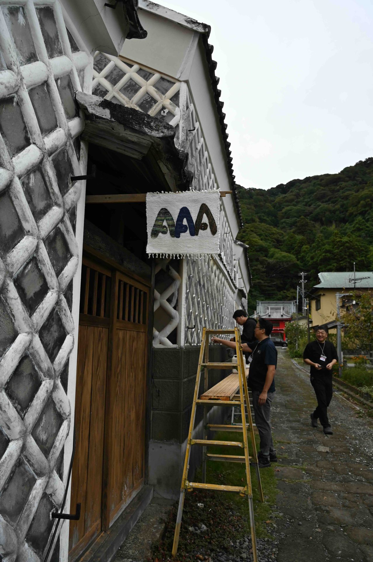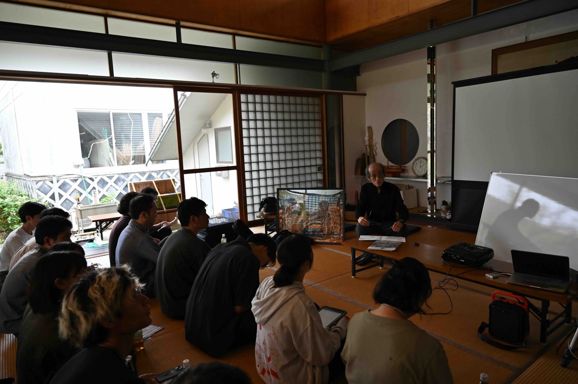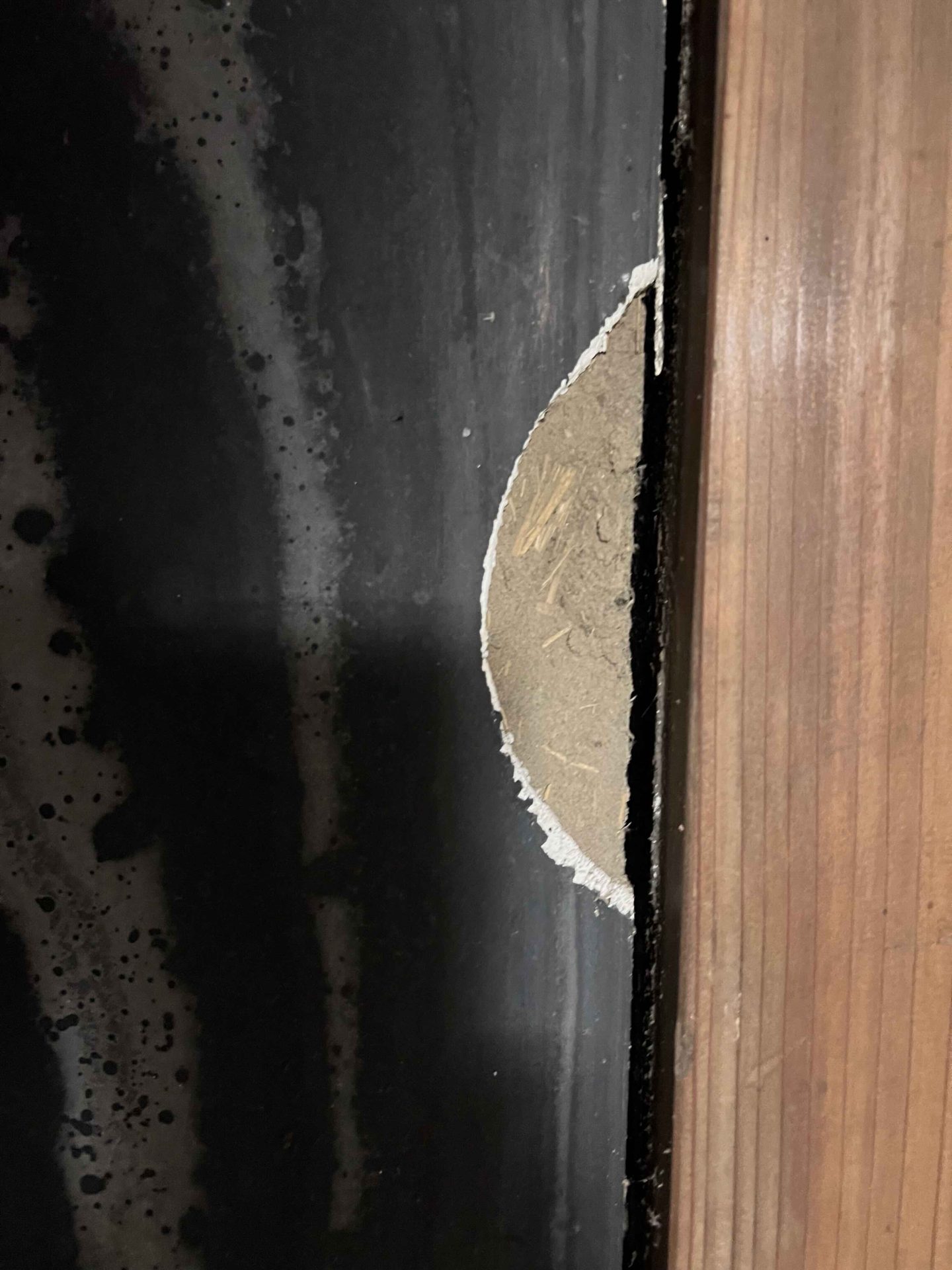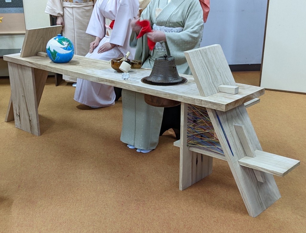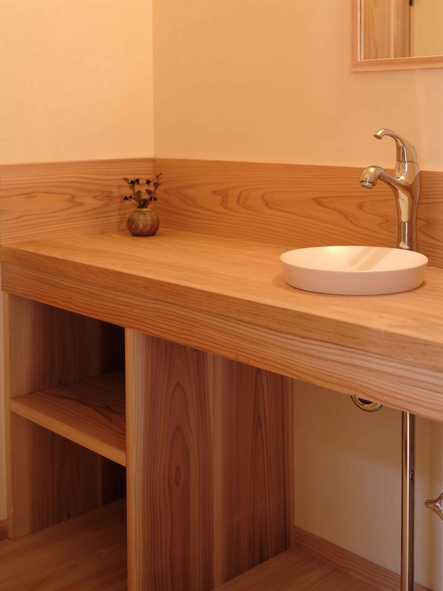 ここまで終わったら、約1ヶ月かけてカラカラに乾燥させる。冬場の場合は、もう少しかかることもある。伝統構法の土壁というのは、こういうところで時間がかかるので、工期に制限があると使いにくいのだけれど、一生に一度の大切に家であるからこそ、これくらいの余裕は持ちたいものだ。乾燥したら、上塗りに入る。上塗りは聚楽土・稲荷山黄土・浅葱土・白土など、様々な産地の土を好みで用いる。これらの土には様々な色があって、好みに応じてブレンドして使うこともできる。ますいいリビングカンパニーのモデルハウスにある茶室には、聚楽土と沖縄の赤土を混ぜた、少し鮮やかな土壁が塗られている。僕の家の茶室には、グーッと色が沈み込んだような錆びた色合いの聚楽土を塗ってもらった。上塗りの際には「土・細かい藁・砂」を混ぜた上塗り土を2回に分けて、薄く塗りつける。その仕上げ方も、フワッとした感じの平滑な仕上げから、コテを引きずって仕上げる引きずり仕上げ、太くて長い藁を円相の形に散らしたところに薄く土を塗りつけて引きずって仕上げる投げすさ仕上げなど様々だ。投げすさ仕上げというのは、千利休が作ったとされている、京都の大山崎にある妙喜庵「待庵」の壁の仕上げである。僕の家の茶室の床間の中はこの投げスサ仕上げなのだが、時間と共に、少しずつ土が錆びてきて、対照的に藁がボンヤリ姿を現してくる様子は、見ていてとても楽しい物である。左官の壁は時間を感じることができるのだ。今回の床の間の中は、黒い仕上げとしてそこにシルバーの紅葉の模様を散らす。これは改修工事前の床の間の意匠と同じである。
