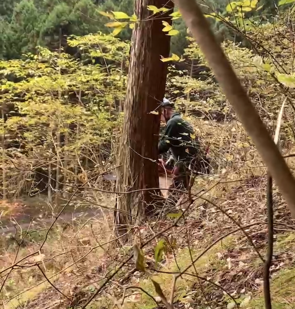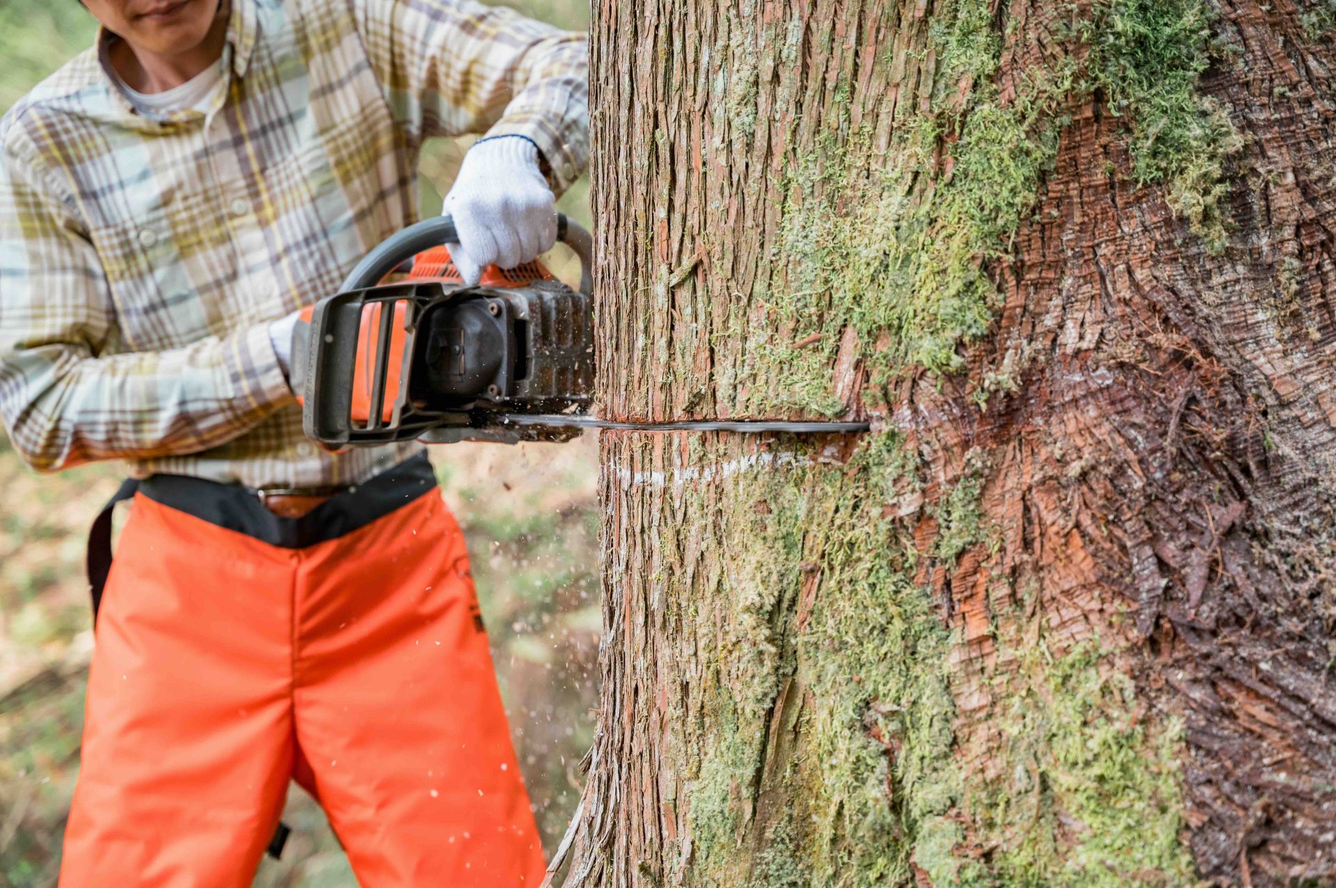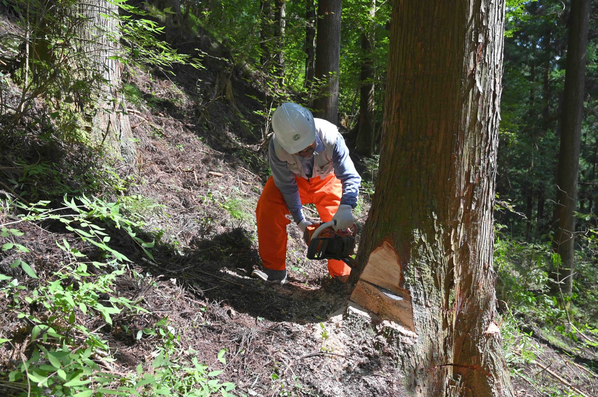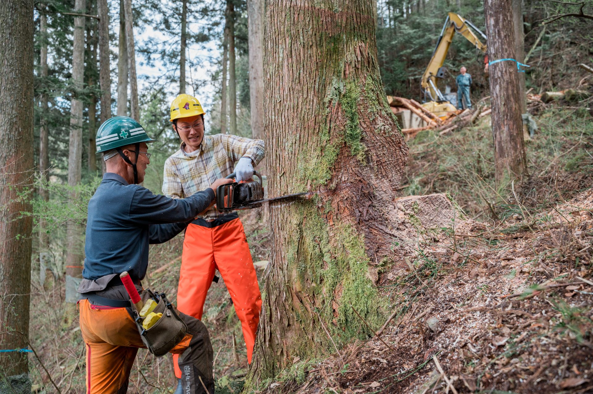 チェーンソーで切っているのは、施主本人。経験者ということで、今回は最後までお施主さんにやっていただいた。通常は途中で木こりさんに交代する。