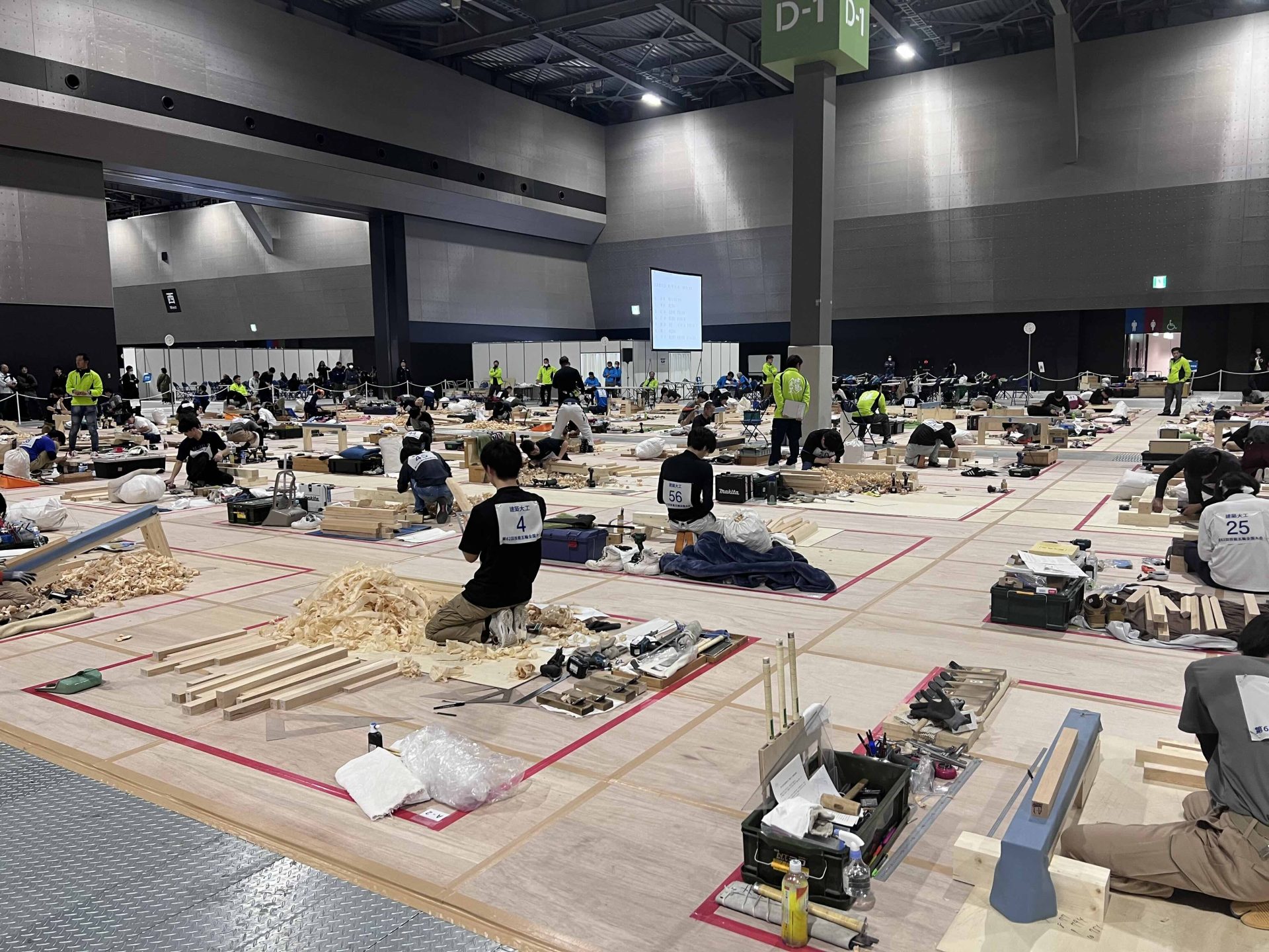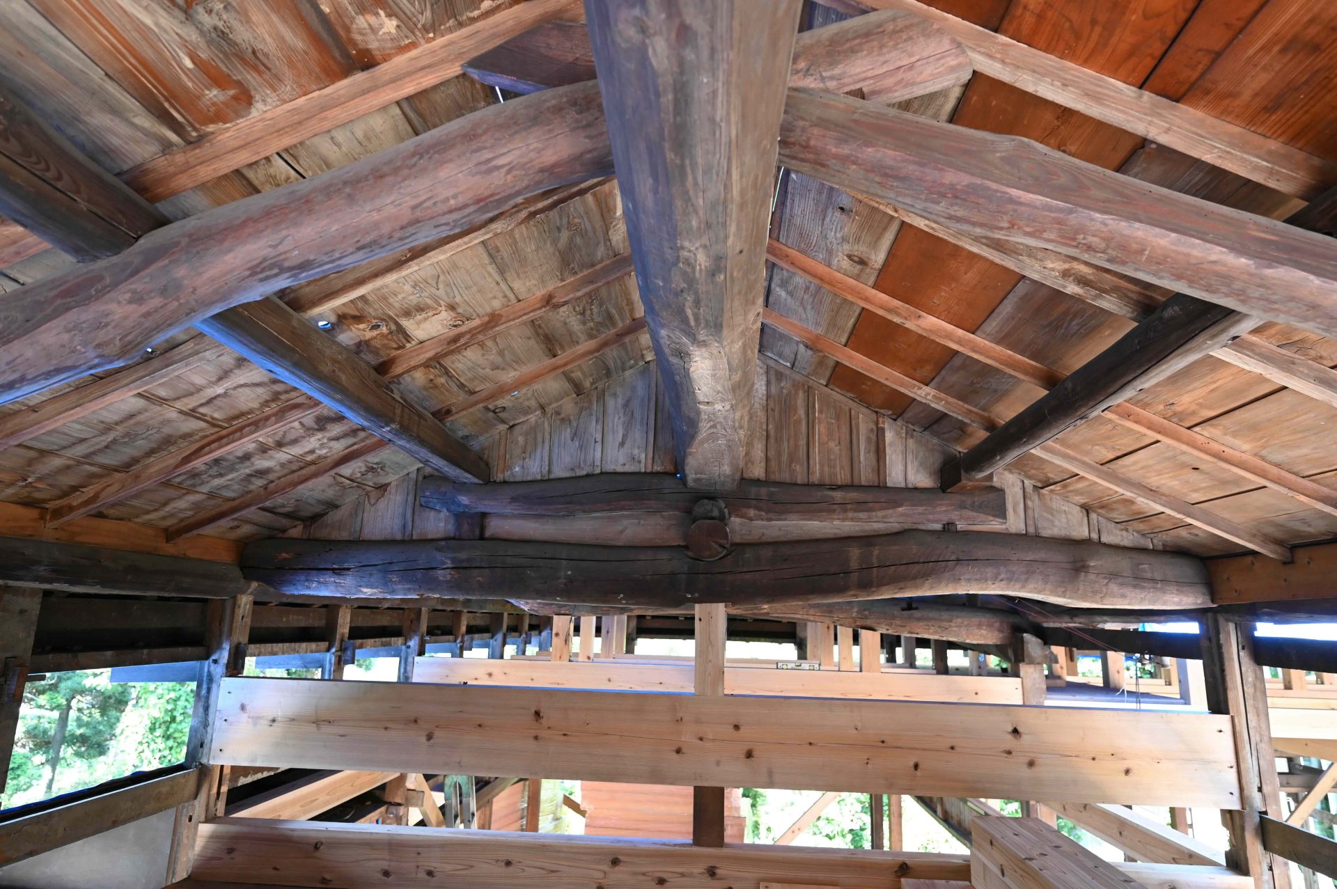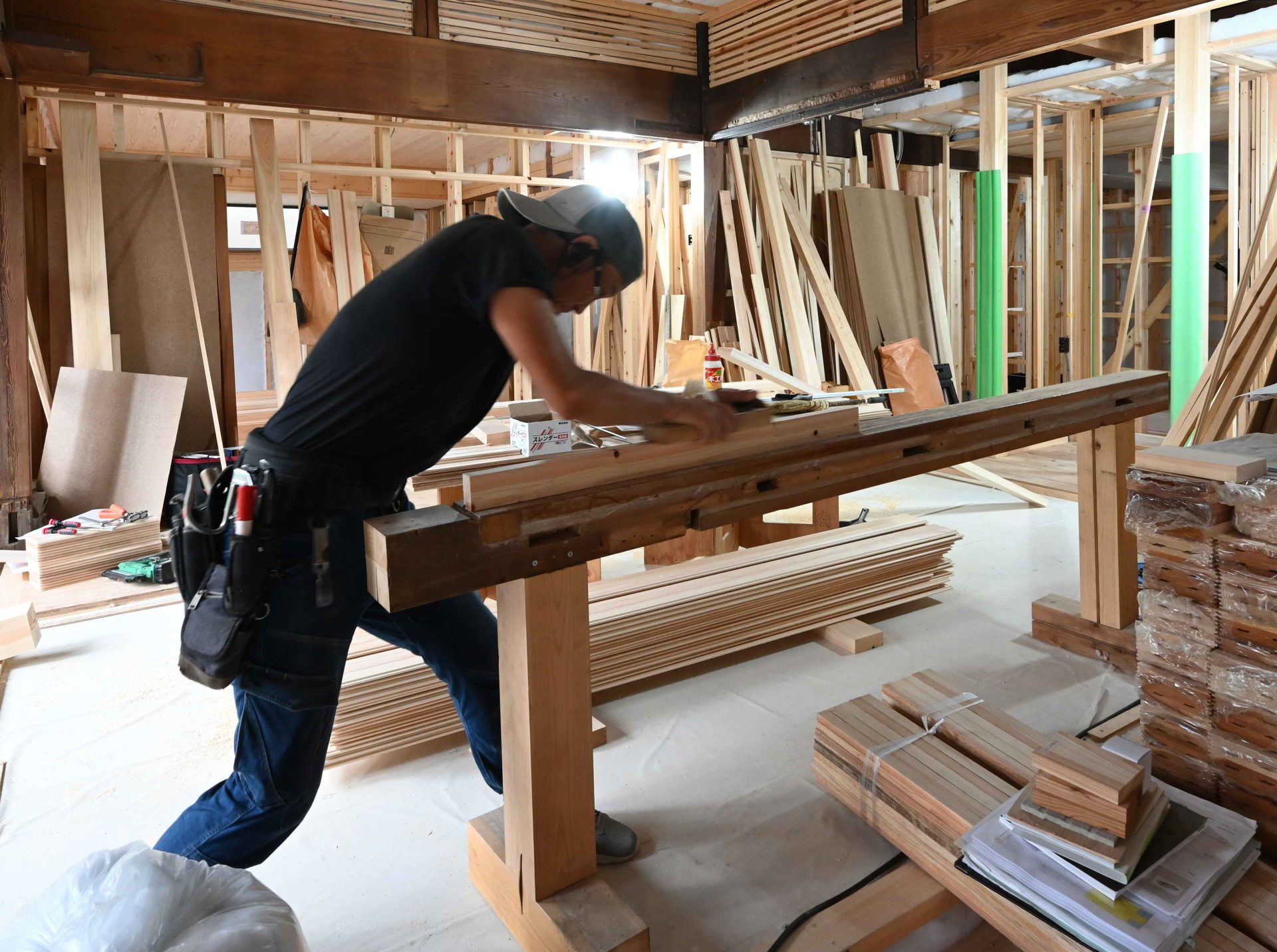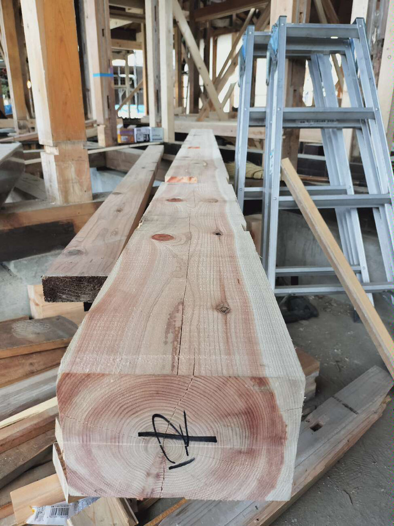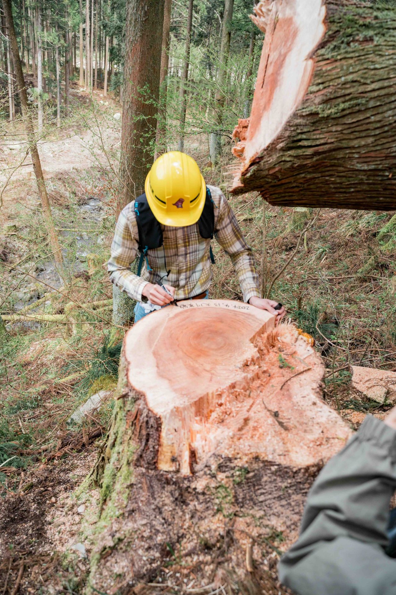 チェーンソーで切っているのは、施主本人。経験者ということで、今回は最後までお施主さんにやっていただいた。通常は途中で木こりさんに交代する。