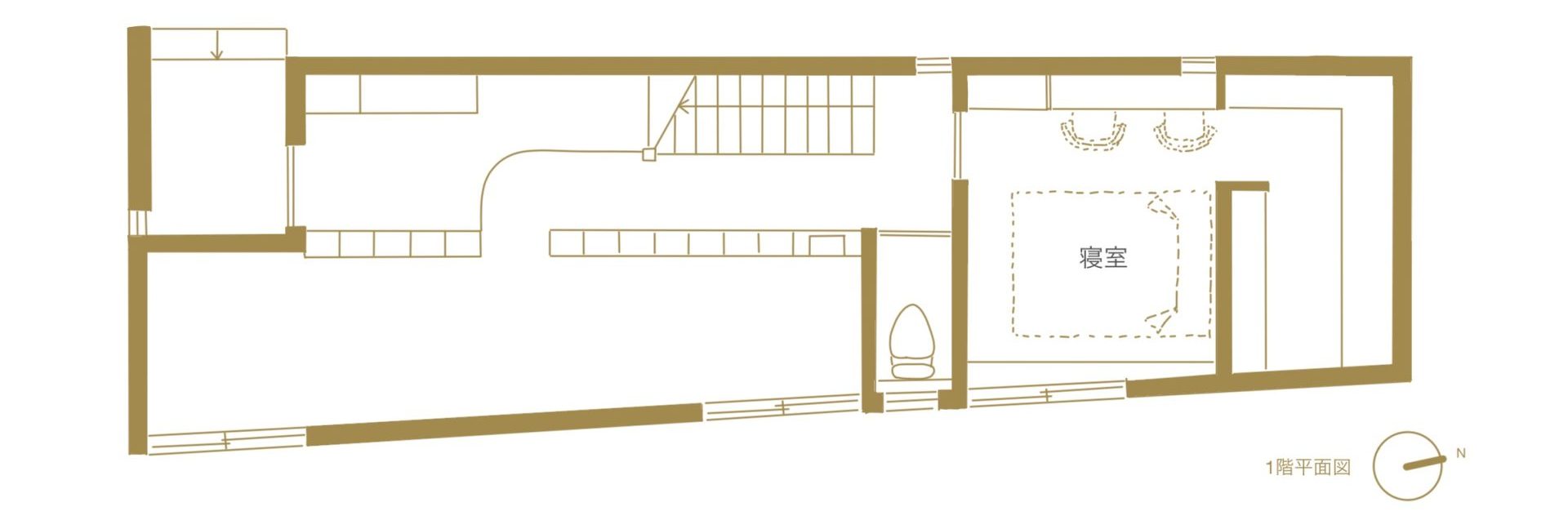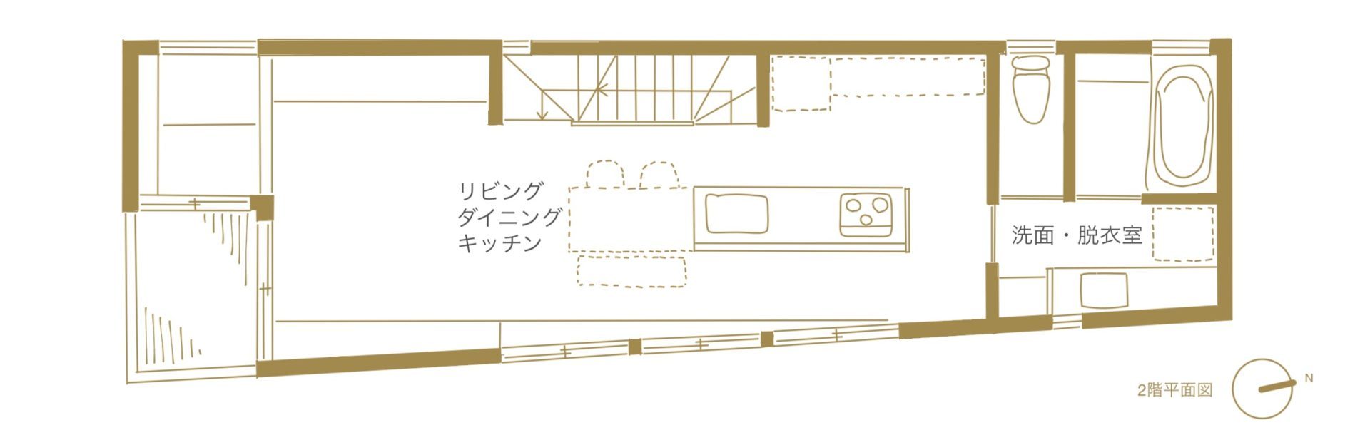 1階に個室、2階にLDK+水回り、ロフトの構成。2階は車線を避けて天井高さを上げ、開放感を出しています。