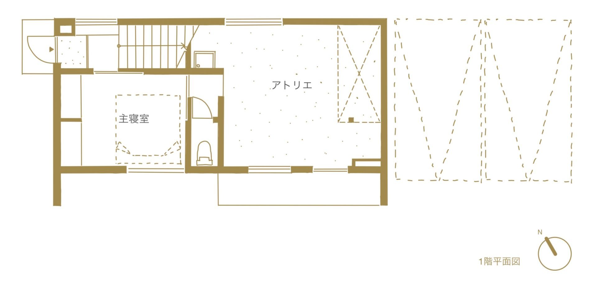 1階の革製品を製作する作業場にはご主人のこだわりの道具に囲まれた空間があり、構造合板と梁アラワシの天井と革収納の構造体で作った棚が趣味のアンティークと相性の良い空間となるようしました。2階には夫婦の趣味の本が壁面に収納され、眼前に広がる秩父連山と富士山を切り取った窓、間仕切りを最小限とした広々とした空間に構造の梁で柔和に空間を分割しました。